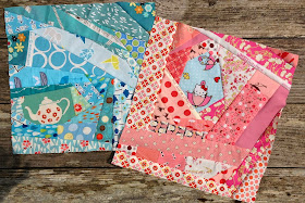 When digging through my scrap bins I really only had two piles of scraps big enough to make a block: teal/aqua and pink. I thought they looked OK as a pair, so I went for it. The aqua block has a Melody Miller teapot as the fussy cut focus point. The pink block has a little Hello Kitty, the only thing in a pink vein that I have to fussy cut!